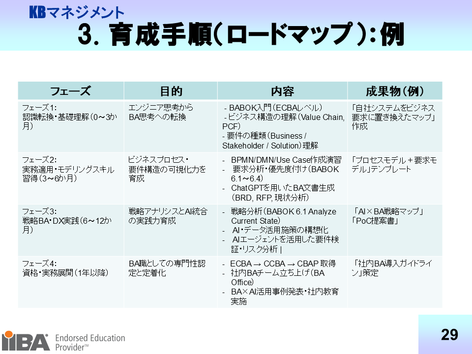経営層の理解 | 「BA育成=AI時代の人材戦略」として位置づけ |