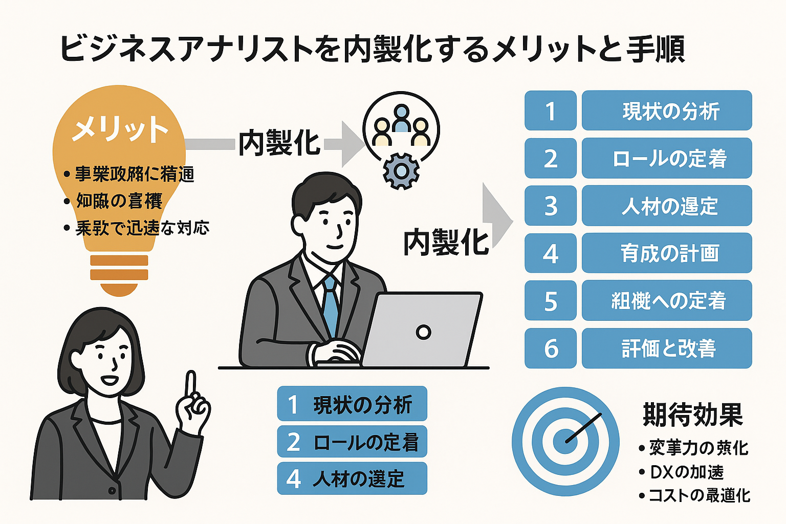 ビジネスアナリスト(BA)を外部委託ではなく内製化(社内育成・配置)することには、企業の変革力やDX推進力を高める大きな戦略的意義があります。そのメリット、内製化のステップ(手順)、そして成功のポイントを説明します。