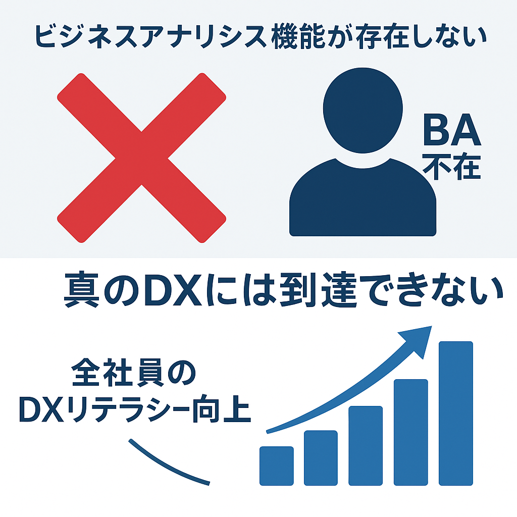 ビジネスアナリシス(BA)機能が存在しない組織では、いくら全社員のDXリテラシーを底上げしても「真のDX」には到達できません。以下で、体系的にその理由と構造を整理します。