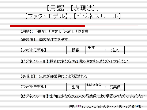 用語、表現法、ファクトモデル、ビジネスルールの関係をまとめると次の図のようになります。